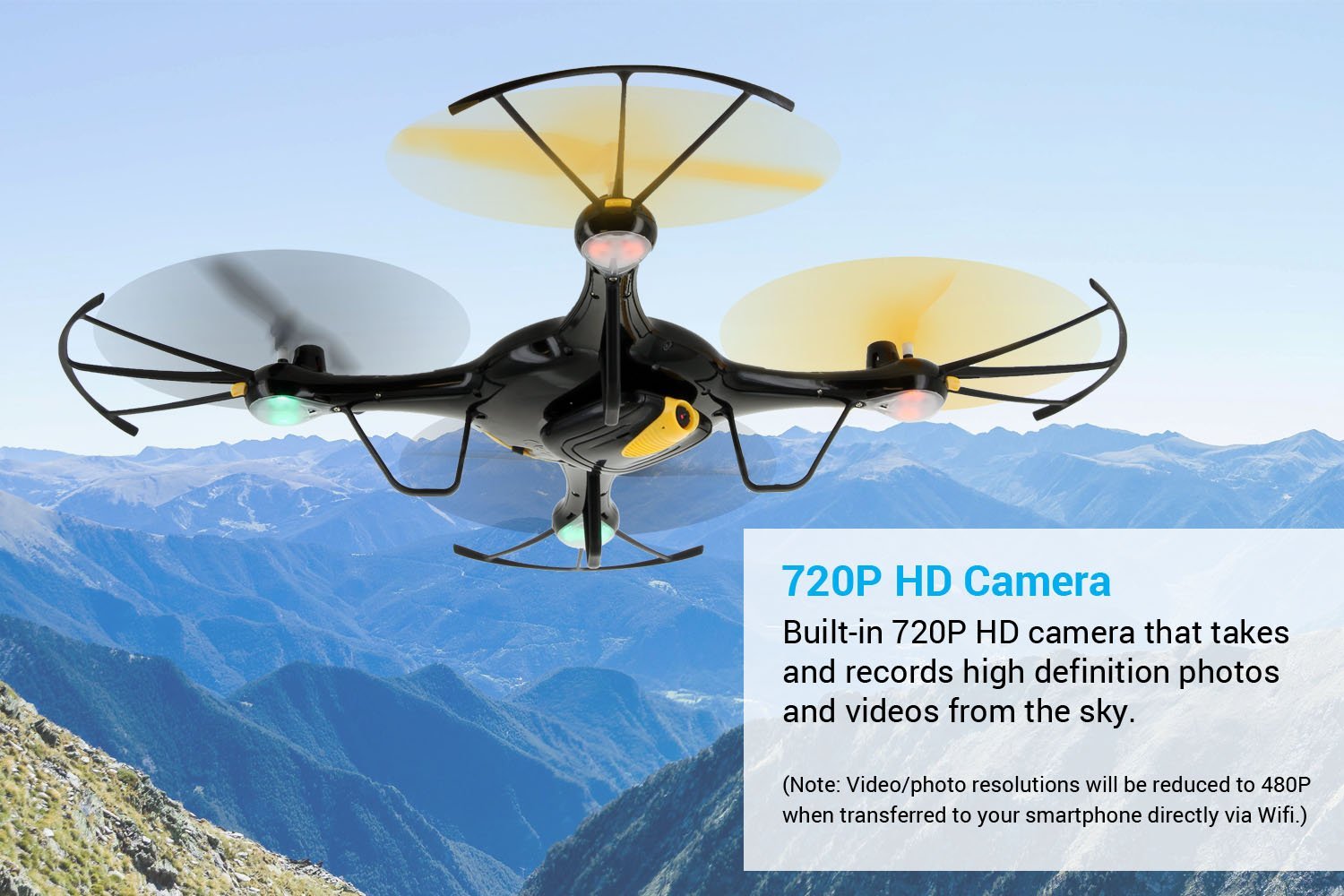 DRON con cámara incorporada 720P HD que toma y graba fotos y videos de alta definición desde el cielo.
