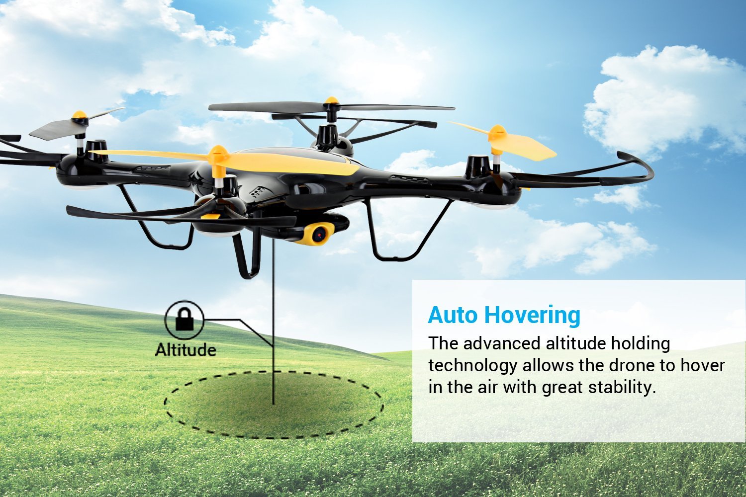 La avanzada tecnología de retención de altitud permite al avión no tripulado volar en el aire con gran estabilidad.